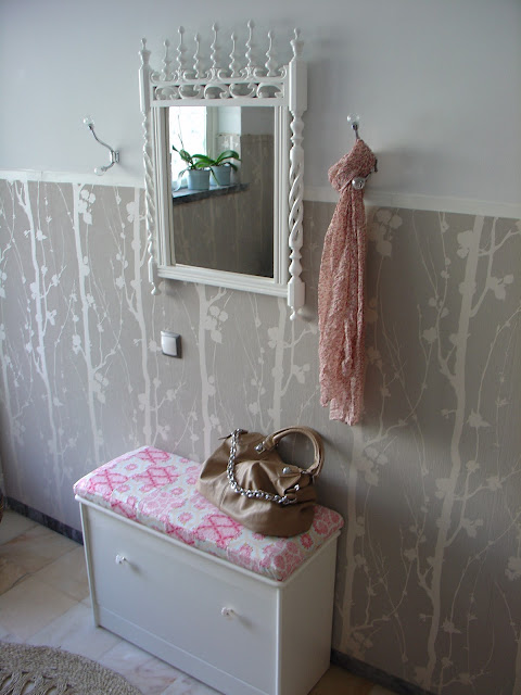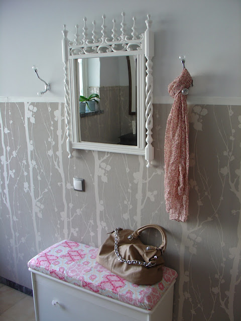 Desta vez, a Lindsey apresentou o espelho antigo que eu achei no lixo e que reciclei para a nossa entrada.