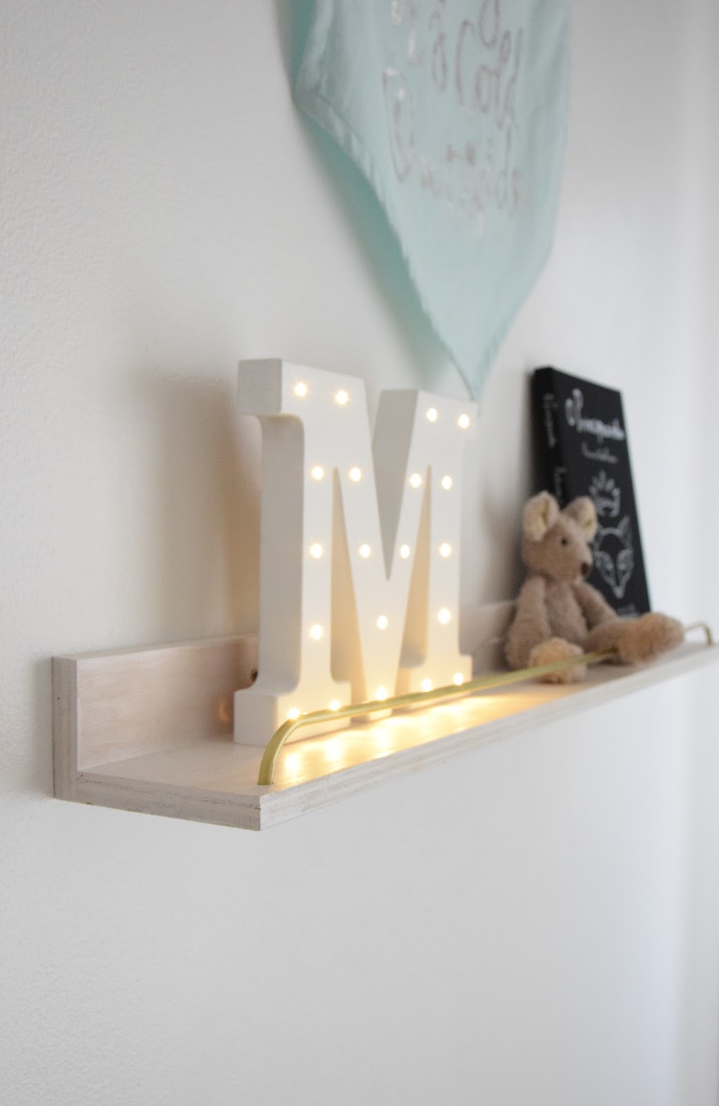 Idealizei uma prateleira de design simples para o nosso quarto, para dispôr alguns elementos decorativos neste cantinho dedicado ao Martim.
