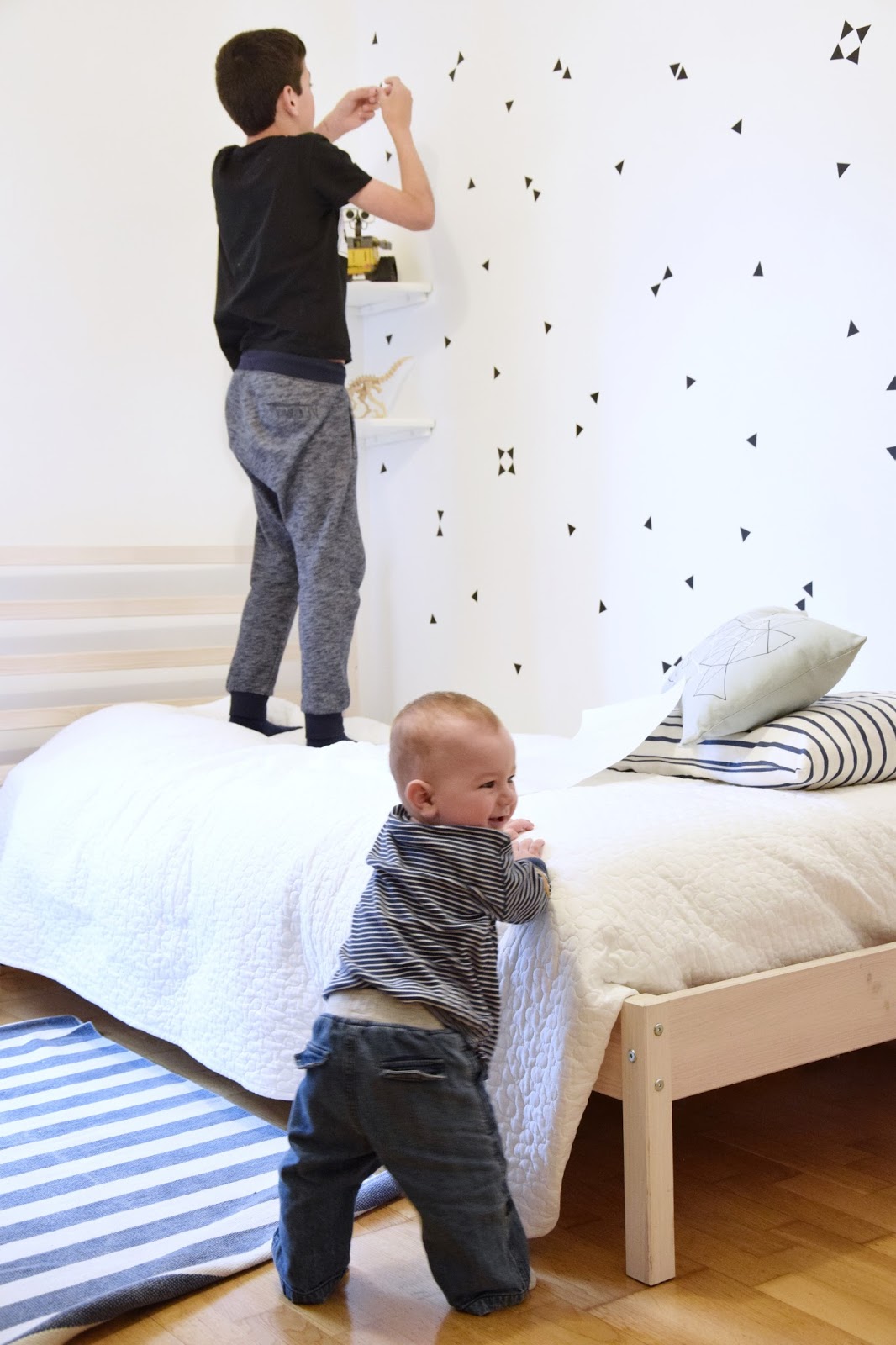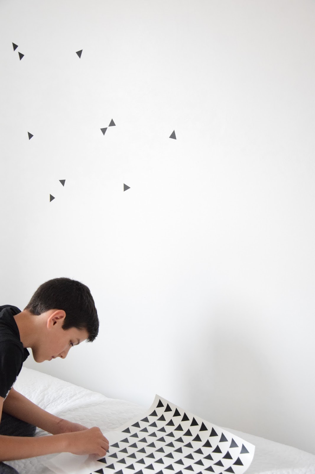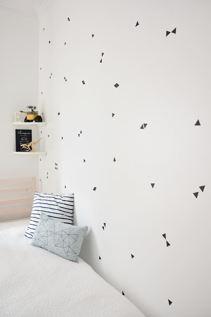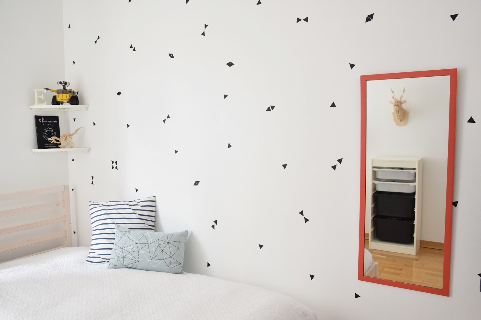 Aguardei uns dias para que a tinta secasse bem para avançarmos com o próximo passo: decorar uma das paredes com adesivos decorativos. Fui abordada pela Tenstickers para experimentar um dos produtos do site, mas acabei por fazer um pedido personalizado: pequenos triângulos em vinil preto mate para dispôr aleatoriamente e dar um visual divertido e de inspiração nórdica ao quarto. É um espaço que também vai servir para o Martim brincar, e por isso quer-se uma decoração jovial e que não se leve demasiado a sério, o que pode não ser fácil de obter quando se usam tons predominantemente monocromáticos, como é o caso. O Eduardo achou piada à ideia e avançámos com os vinis decorativos pela primeira vez na nossa casa.