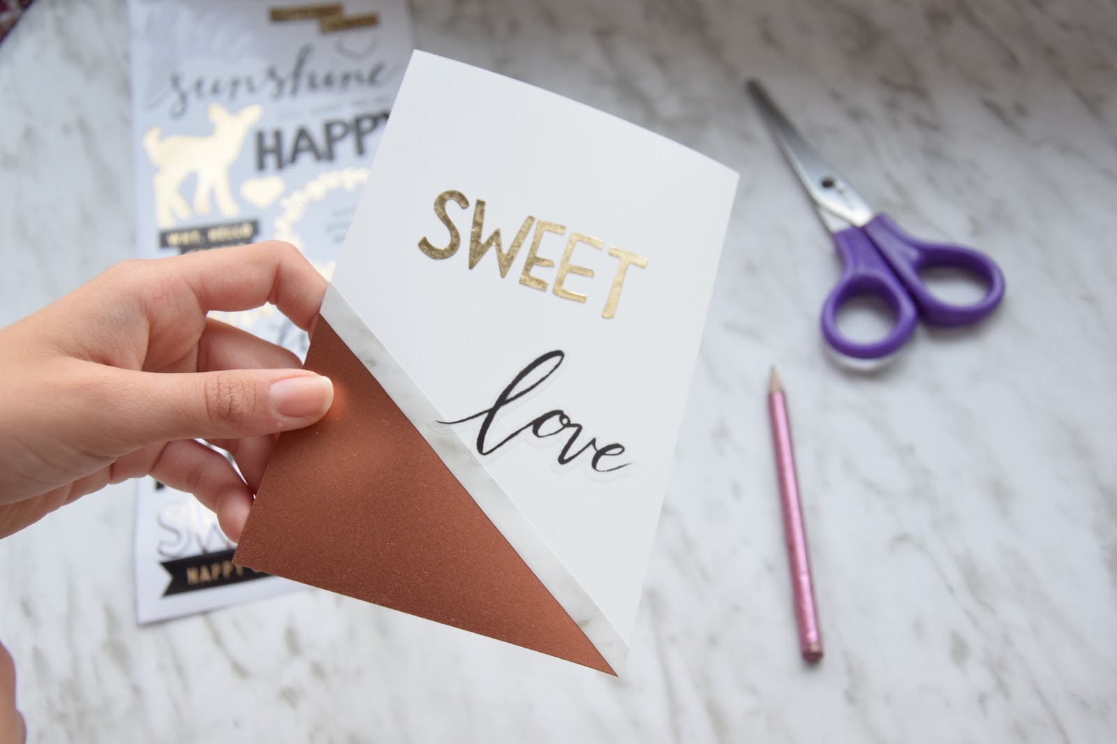 Voltámos a usar o papel adesivo de efeito mármore e spray acobreado para decorar os postais.