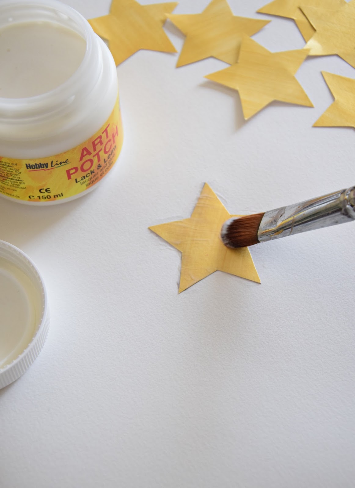 Cada estrela foi pincelada com cola de decoupage. Com um pincel seco, salpicámos glitter dourado em pó tentando cobrir toda a área da estrela de forma homogénea.