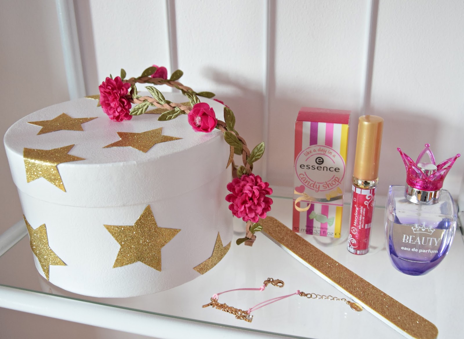 Tinha previsto inicialmente usar esta caixinha para guardar objetos miúdos do bebé como fitas da chucha e coisas do género, mas a Diana gostou tanto das estrelas brilhantes que serve agora para guardar os seus vernizes.