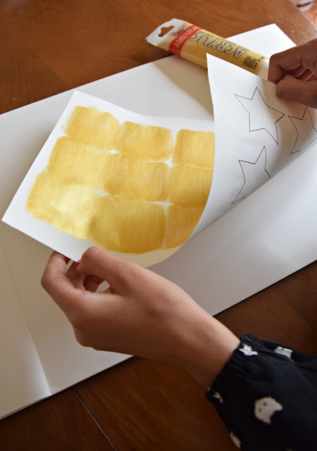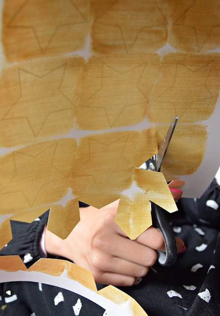 Para as fazer, comecei por imprimir várias numa folha de papel Canson. A Diana pintou-as pelo verso com tinta dourada acrílica (pintura em tela), para depois ao recortar não se verem as margens (e não correr o risco de as mesmas esborratarem).