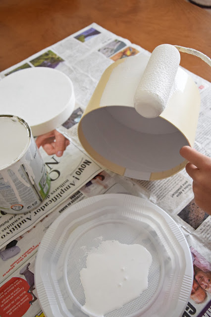 Usámos uma caixinha de cartão redonda para este projeto. Foi toda pintada com tinta acrílica branca, de acabamento acetinado.