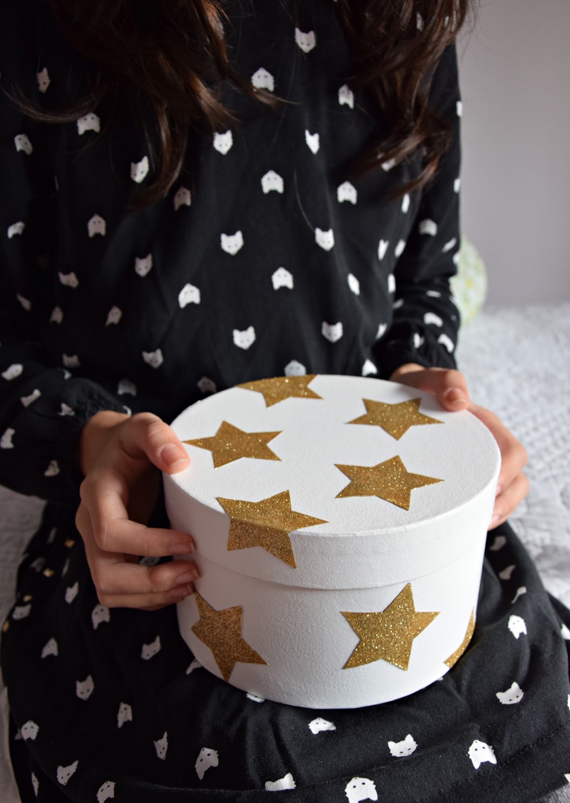Para fixar as estrelas à caixa pintada sem problemas, usei uma cola multiusos. Para não danificar superfícies nem a própria caixinha, coloquei uns pezinhos em feltro autoadesivo.