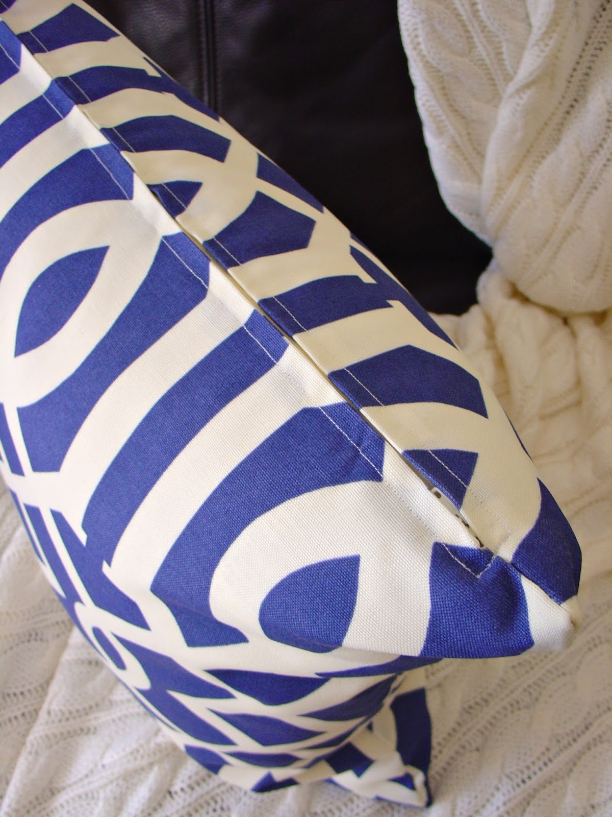 Foi a primeira vez que apliquei um fecho, e não correu nada mal. Preferi fazer as almofadas com fecho em vez de acabamento tipo envelope, porque assim a almofada pode ser usada dos dois lados sem se ver nenhuma aba nem interrupção do padrão.