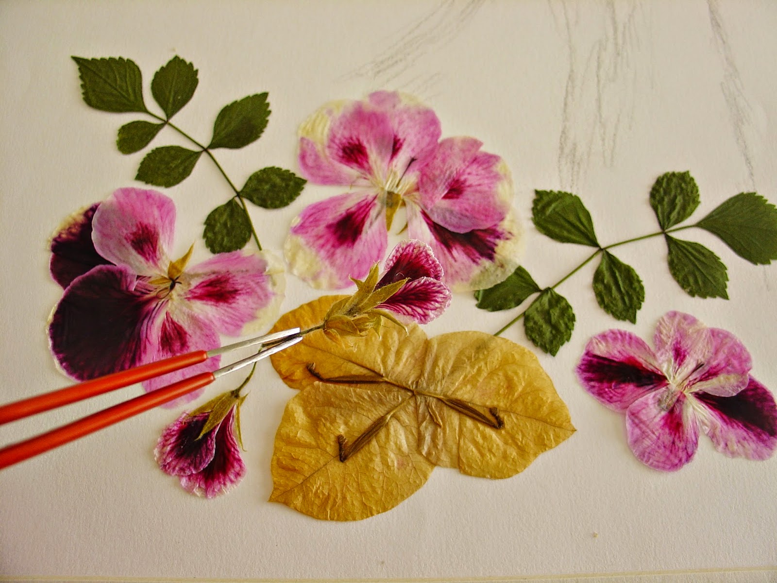 Com as flores dispostas sobre o desenho, ensaiei a melhor forma de conjugar tudo. A tarefa revelou-se complicada..., demorei dias a acertar com uma combinação que me satisfizesse. As flores secas são muito leves e delicadas. Um suspiro e lá fugia tudo do sitio.